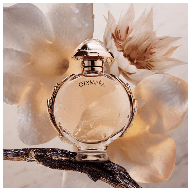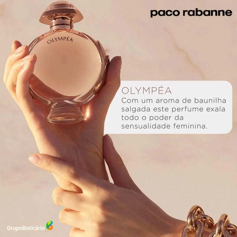 O Perfume Olympéa, Paco Rabanne, apresenta um aroma inesquecível, que traz à tona a feminilidade e determinação da mulher que o usa. Conta com notas de Tangerina Verde, Flor de Gengibre e Jasmim Aquático combinadas com notas de coração de Baunilha Salgada e notas de fundo de Ambergris, Caxemira e Sândalo. O frasco remete a todos os símbolos da glória: o tom rosado da fragrância orna harmoniosamente com o vidro em formato de ânfora, em alusão perfeita aos vasos de cerâmica onde os deuses guardavam as bebidas e as folhas de louro, às coroas da vitória.